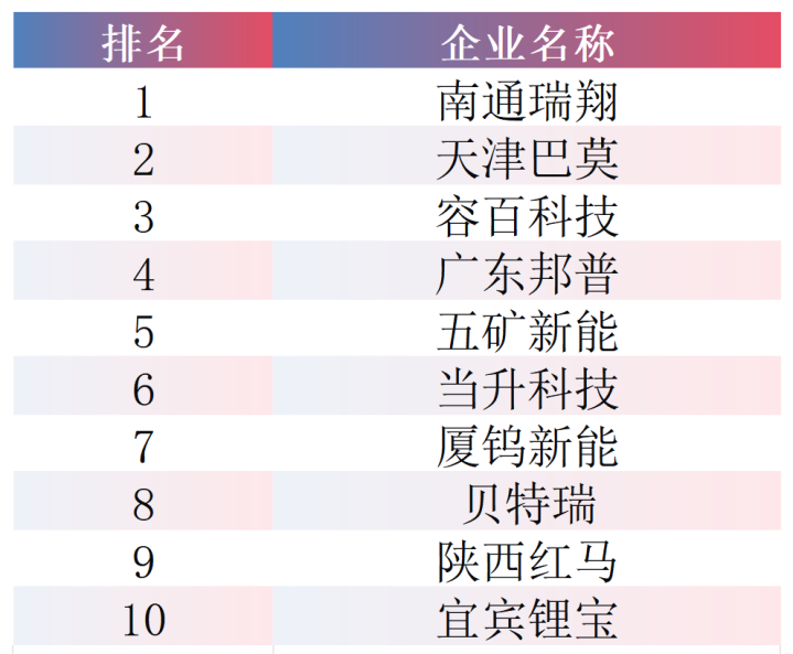 2025年,中国三元材料出货量达78.6万吨,同比增长22.2%。其出货量前十企业分别为:南通瑞翔、天津巴莫、容百科技、广东邦普、五矿新能、当升科技、厦钨新能、贝特瑞、陕西红马、宜宾锂宝。榜单中,南通瑞翔凭借稳定出货量接近20万吨,登顶该赛道榜单首位;天津巴莫排名同比跃升,位列第二;容百科技排名有所下滑,降至第三位。